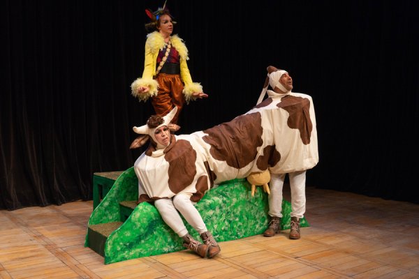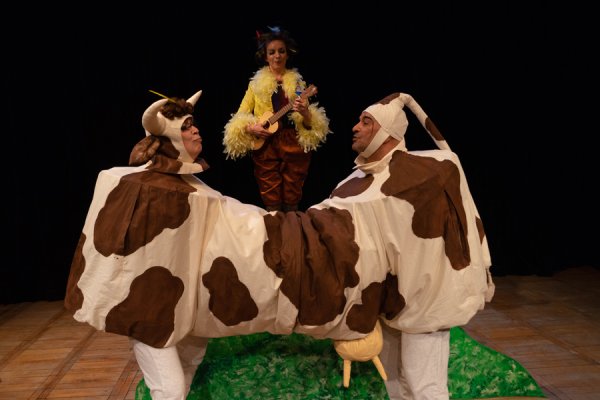 Das Vorderteil der Kuh und das Hinterteil müssten eigentlich zusammenarbeiten, damit die Menschen Milch trinken und Käse essen können -- aber immer öfter sind sich die beiden Hälften uneinig. Vor allem als ein Dritter, der Vogel, dazwischenkommt. Das Hinterteil verliebt sich sofort in den Vogel, weil er so hübsch ist und wunderbar singen kann. Das Vorderteil kann ihn aber nicht ausstehen, weil er so eingebildet ist auf seine Schönheit und seine Flugkünste.