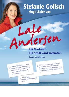 -- das Lied „Lili Marleen" ist das berühmteste Werk von Lale Andersen. Das aufregende Leben und die weltbekannte Musik der Bremerhavenerin leben seit Mai 2012 in einer Konzertserie der Mezzosopranistin Stefanie Golisch neu auf und wurde bereits über 200 Mal aufgeführt. Geschrieben hat das Programm der Regisseur und Autor Uwe Hoppe; am Klavier und Akkordeon begleitet sich die Sängerin selbst.