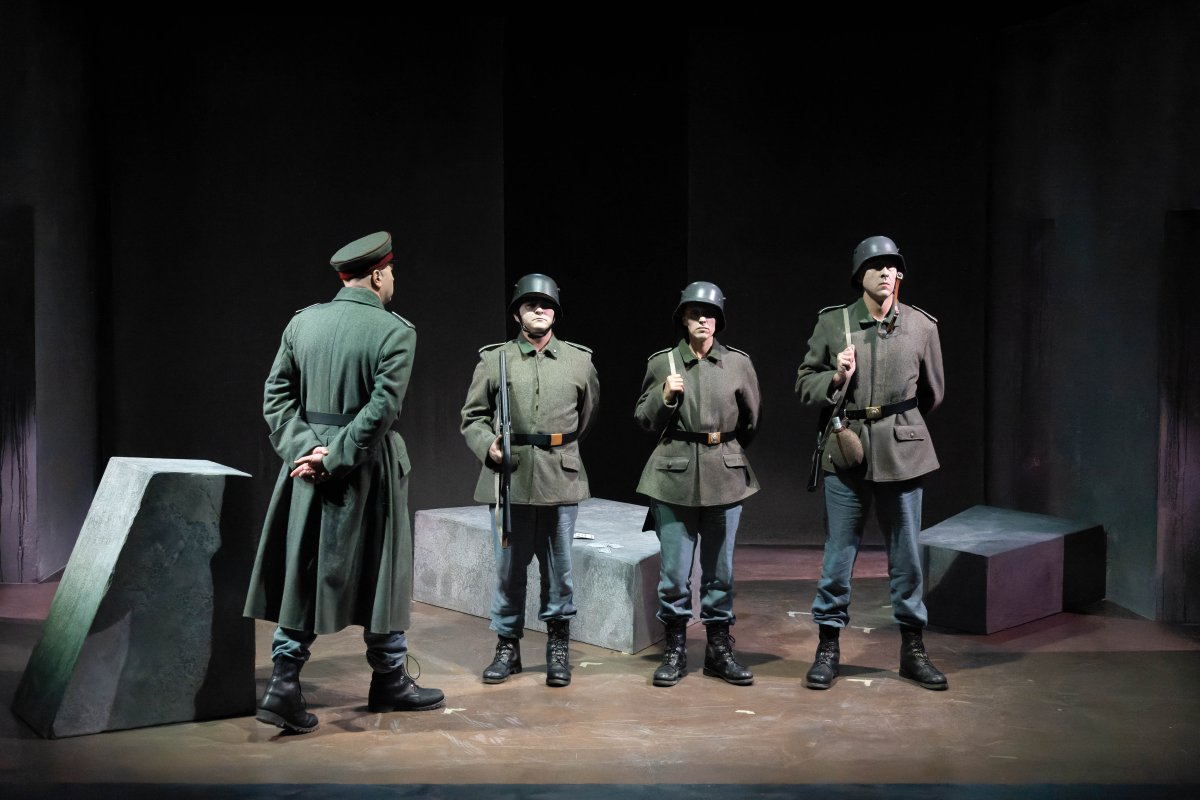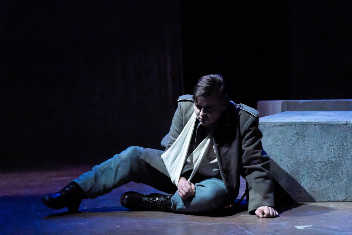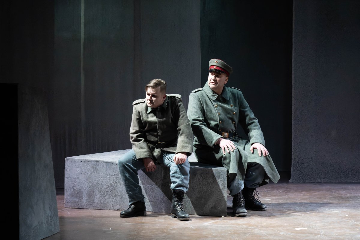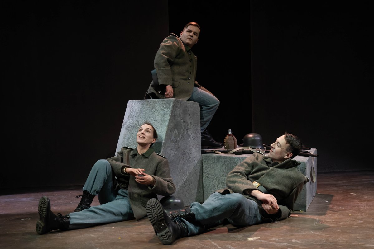 Doch die Wahrnehmung verändert sich, als der Soldat nach einer Verwundung beginnt, die Worthülsen der Propaganda zu hinterfragen und den unbedingten Glauben an „unsere Führer" zu verlieren. Dazu bringt ihn auch das Nachdenken über seine Mitmenschen, über seinen Vater, eine „ferne Geliebte" oder seinen Hauptmann. Auch die Einführung dieser stark typisierten Charaktere, mit denen sich der Soldat in Dialog und Monolog auseinandersetzt, prädestiniert diesen Anti-Kriegs-Roman geradezu für eine Bühnenfassung, die eigens von Dorothea Kirschbaum für die Studiobühne erstellt wird.