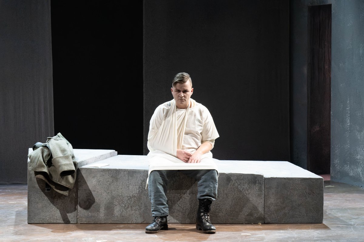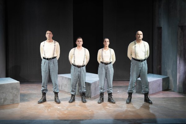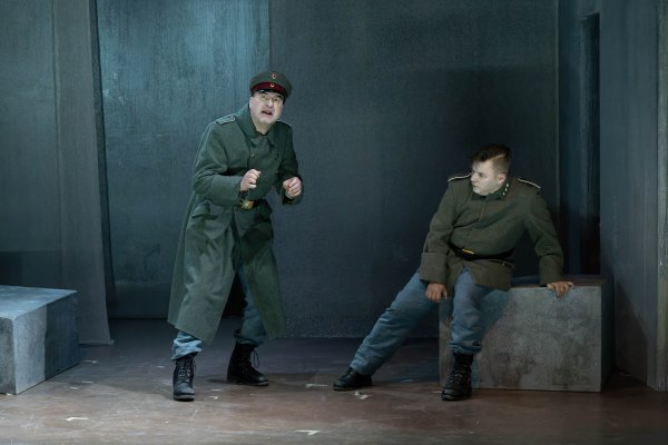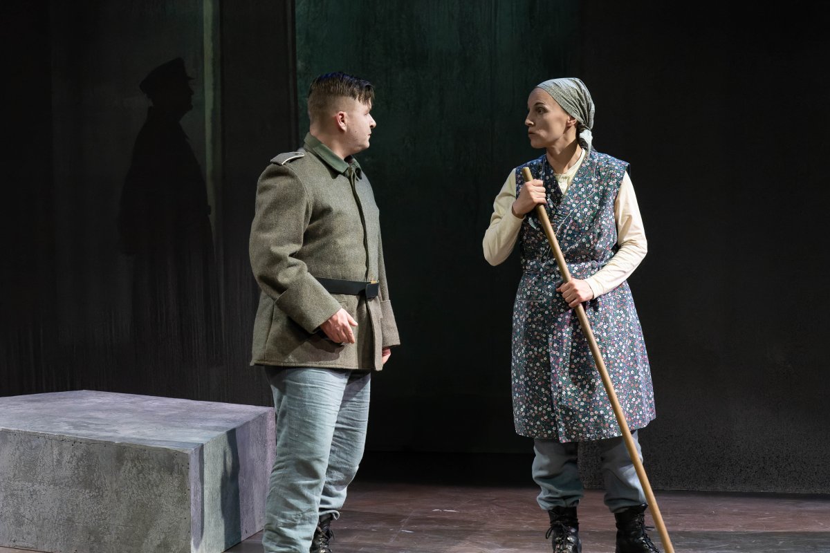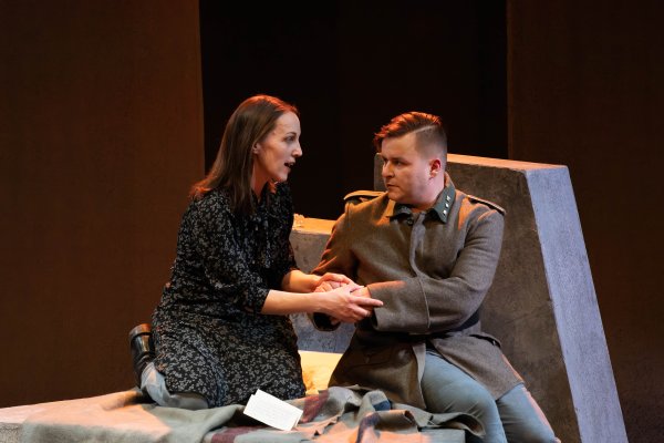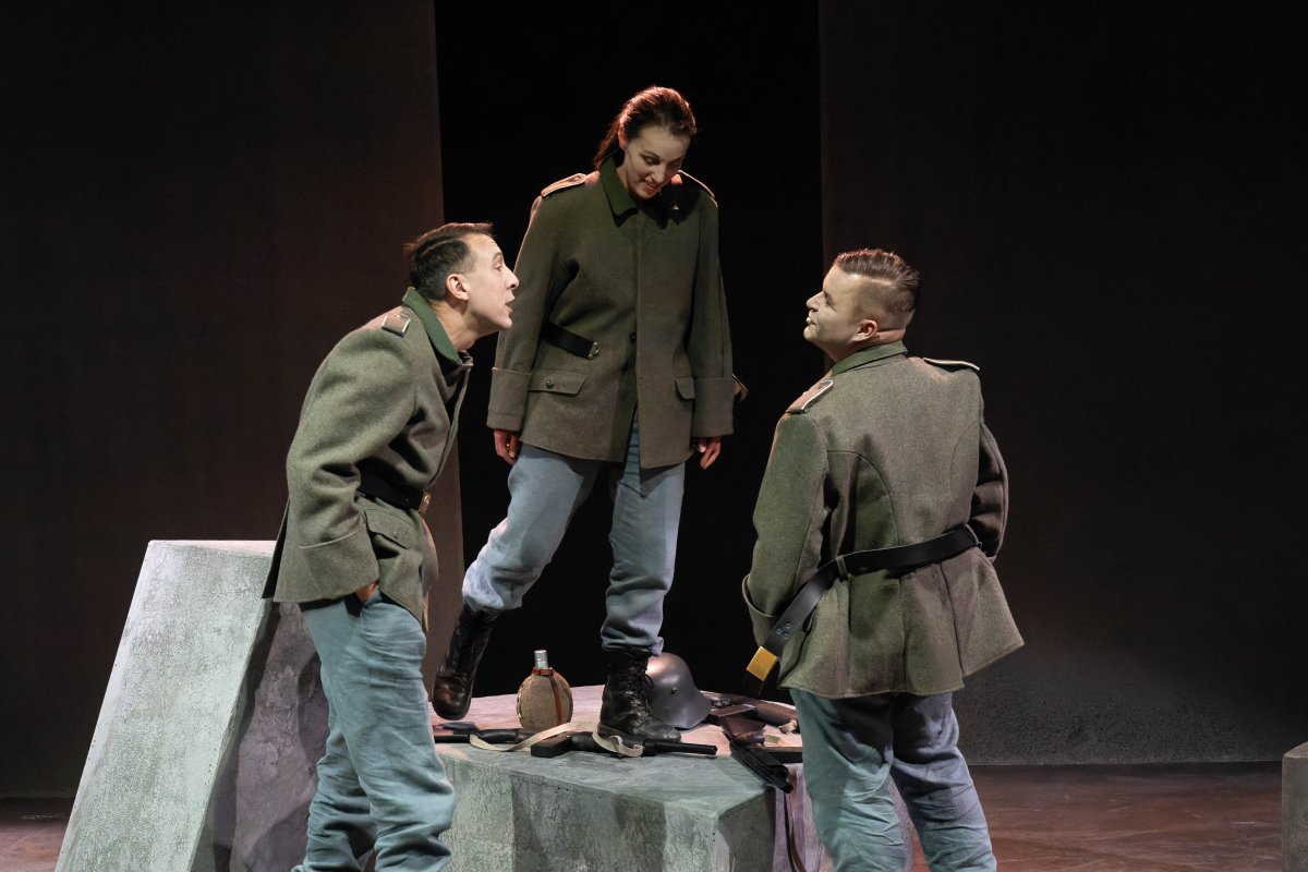 Doch die Wahrnehmung verändert sich, als der Soldat nach einer Verwundung beginnt, die Worthülsen der Propaganda zu hinterfragen und den unbedingten Glauben an „unsere Führer" zu verlieren. Dazu bringt ihn auch das Nachdenken über seine Mitmenschen, über seinen Vater, eine „ferne Geliebte" oder seinen Hauptmann. Auch die Einführung dieser stark typisierten Charaktere, mit denen sich der Soldat in Dialog und Monolog auseinandersetzt, prädestiniert diesen Anti-Kriegs-Roman geradezu für eine Bühnenfassung, die eigens von Dorothea Kirschbaum für die Studiobühne erstellt wird.