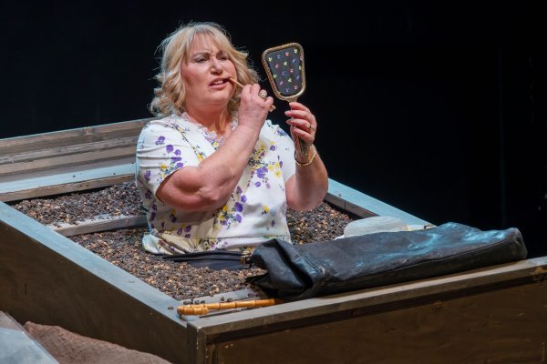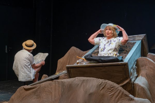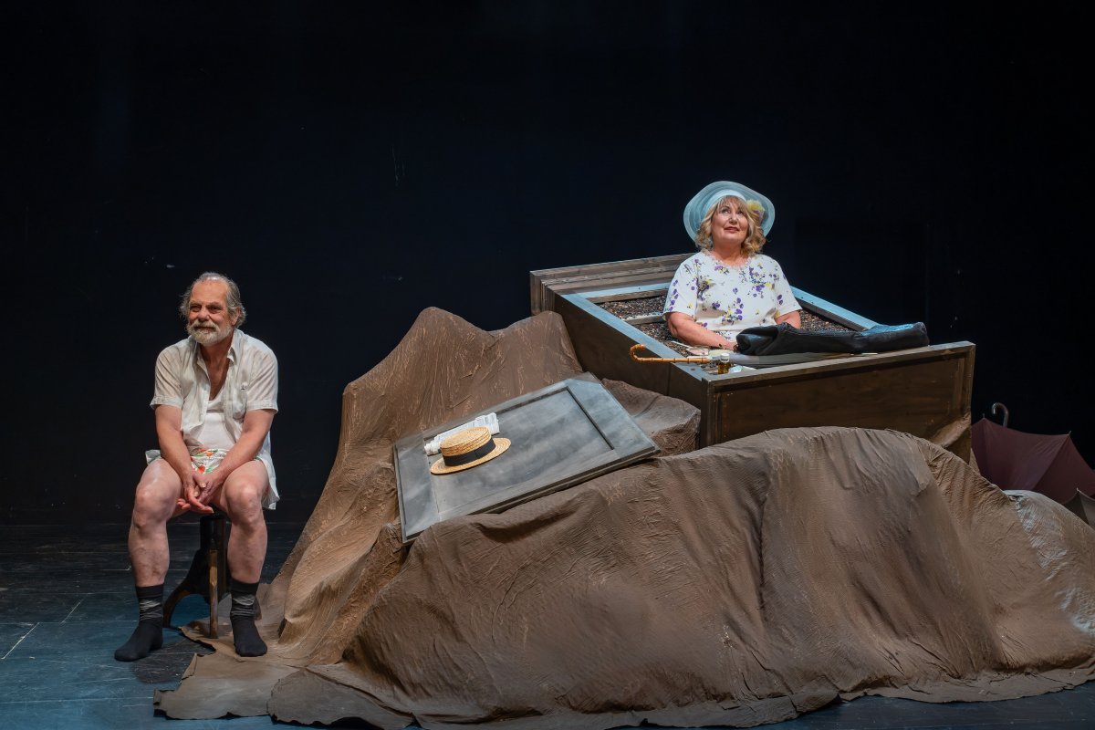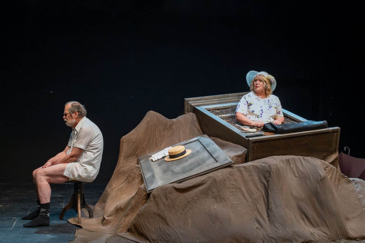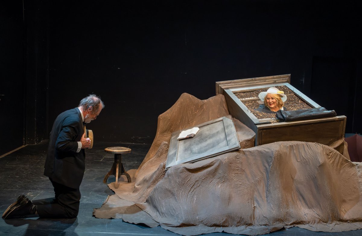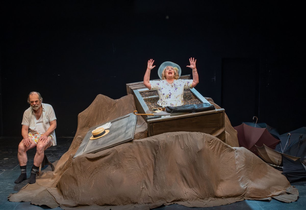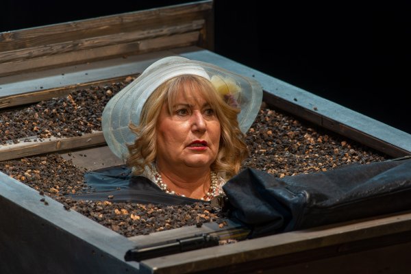 Becketts Portrait eines gealterten Paares, das sich trotz aller Widrigkeiten immer noch liebt, aber trotz aller Liebe zu keiner Nähe mehr finden kann: eingemauert in einen stetig wachsenden Erdhügel monologisiert Winnie ihrem erinnerungssatten Lebensabend entgegen. Willie -- ihr schwerhöriger, wortkarger Ehemann, der sich nur kriechend fortbewegen kann -- dämmert derweil kaum sichtbar in einem Erdloch vor sich hin. Winnie hört nicht auf zu reden: im krassen Widerspruch zu ihrer ausweglosen äußeren Situation stilisiert sie sich permanent zum Inbegriff eines glücklichen Menschen. Sie klammert sich an die Objekte ihres Alltags wie Zahnbürste oder Kamm, sowie an Sicherheit vermittelnde alltägliche Abläufe, stets bemüht, ihre Tage zu glücklichen zu erklären. Die routiniert-unnahbare Zweierbeziehung wird von Beckett entlarvt: ein ans Absurde grenzender Zweckoptimismus zerfließt zu allergrößter Verzweiflung -- und umgekehrt. Der irische Schriftsteller Samuel Beckett erhielt 1969 den Nobelpreis für Literatur und gilt als eine der Schlüsselfiguren der Moderne sowie des absurden Theaters. „Glückliche Tage", einer der radikalsten Theatertexte des zwanzigsten Jahrhunderts, wurde 1961 in New York uraufgeführt und thematisiert das Überleben des Menschen durch Anpassung an scheinbar unerträgliche Lebensumstände. Bereits kurz nach der Premiere nahm die britische Tageszeitung „The Independent" das Stück in ihre Liste der „40 besten Stücke aller Zeit" auf.