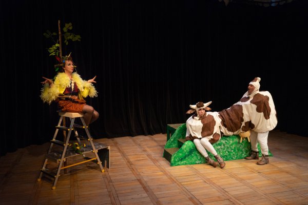Das Vorderteil der Kuh und das Hinterteil müssten eigentlich zusammenarbeiten, damit die Menschen Milch trinken und Käse essen können -- aber immer öfter sind sich die beiden Hälften uneinig. Vor allem als ein Dritter, der Vogel, dazwischenkommt. Das Hinterteil verliebt sich sofort in den Vogel, weil er so hübsch ist und wunderbar singen kann. Das Vorderteil kann ihn aber nicht ausstehen, weil er so eingebildet ist auf seine Schönheit und seine Flugkünste.