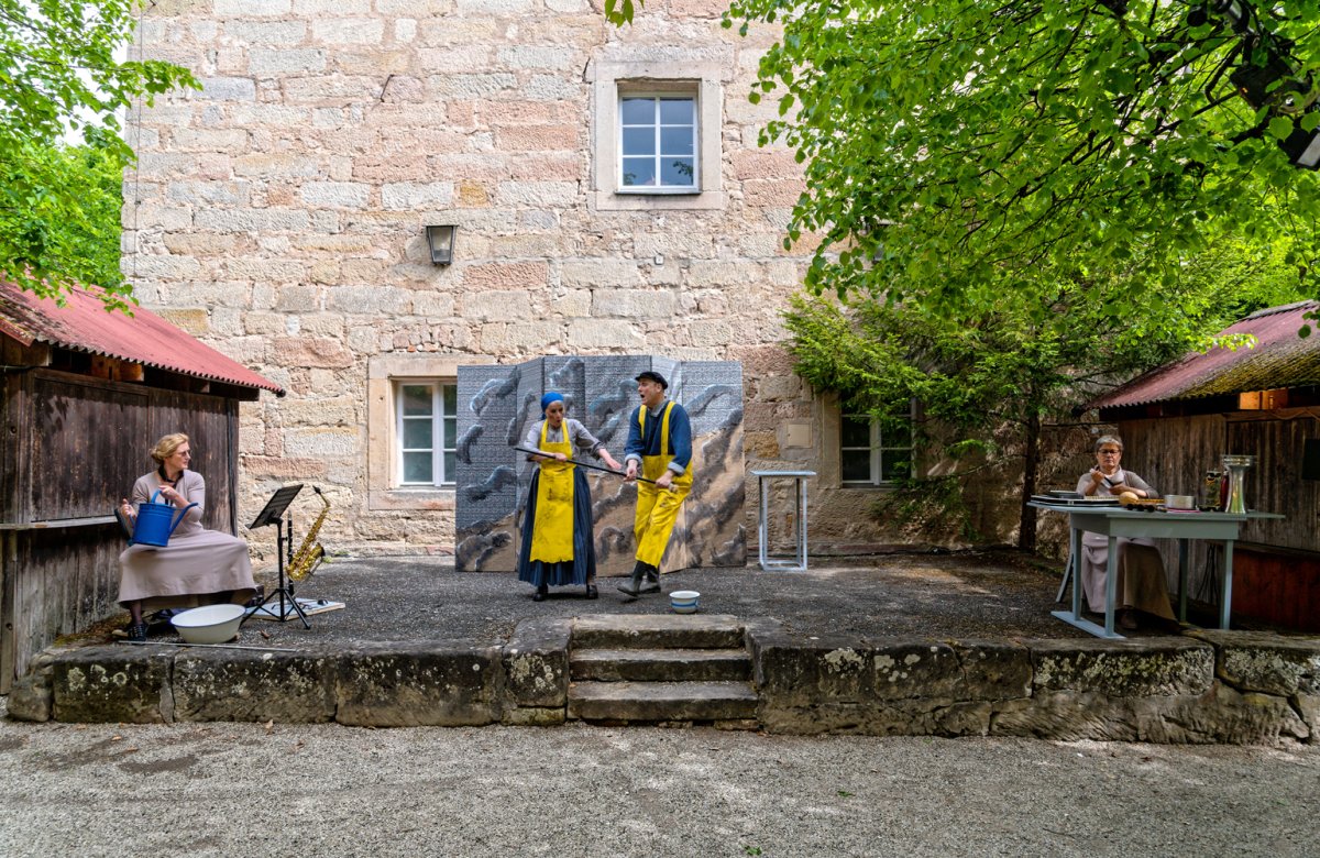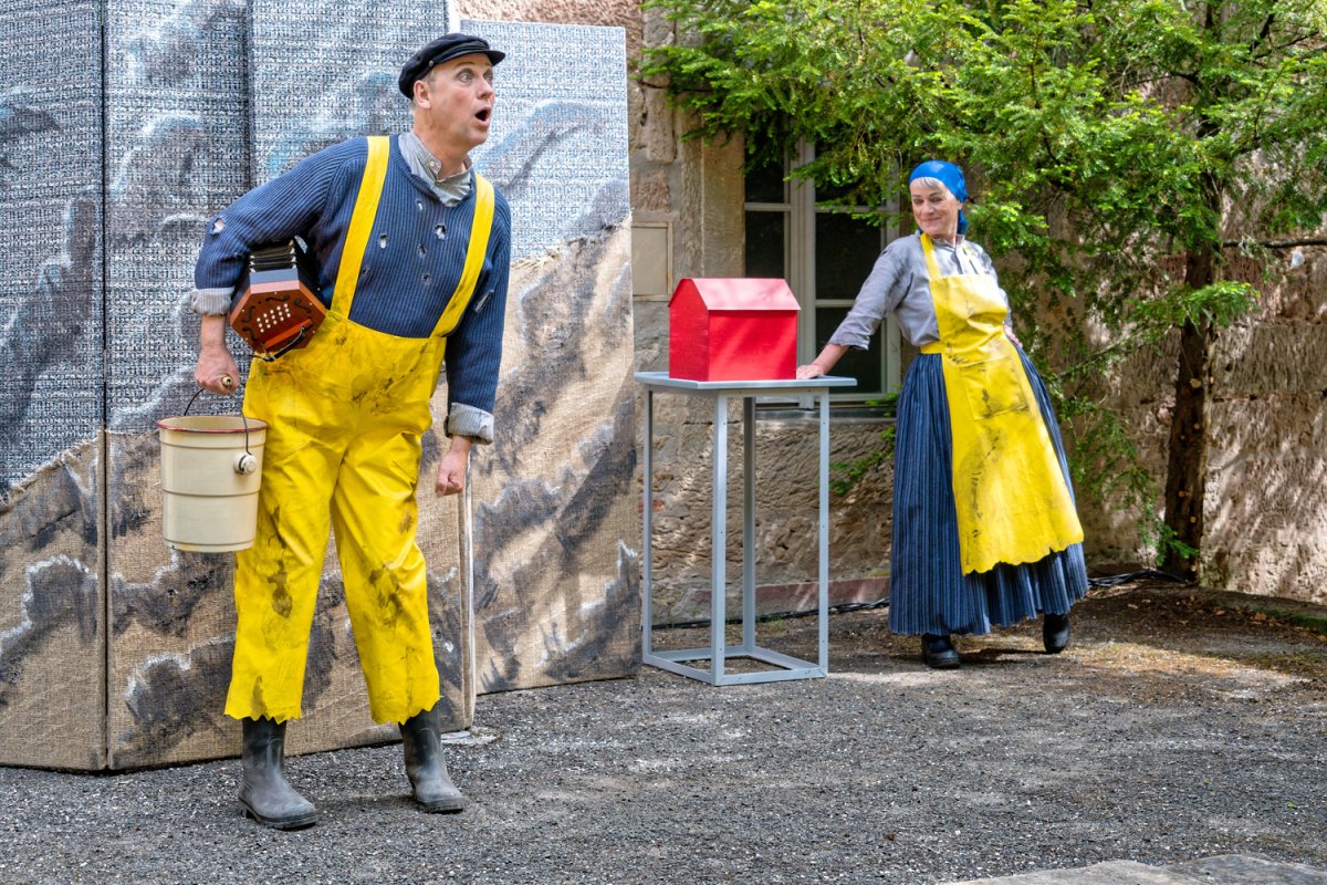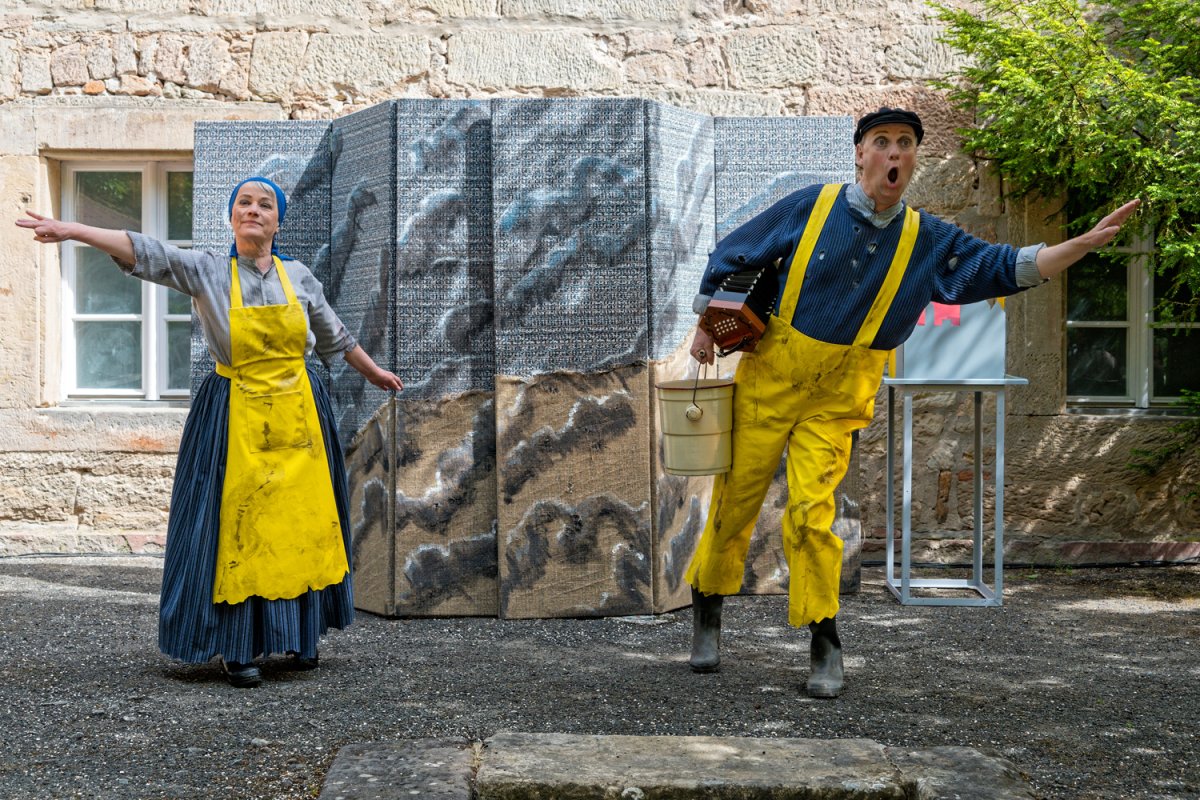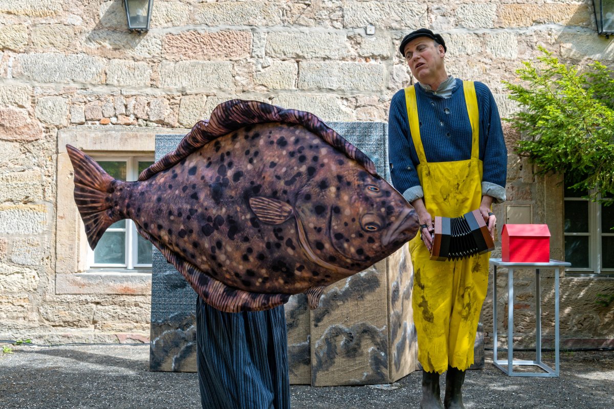 Mit einfachen Theatermitteln und viel Livemusik und Gesang bringen vier Darstellerinnen und Darsteller das berühmte Märchen vom Butt und dem Fischerpaar lebendig und kurzweilig auf die Bühne.