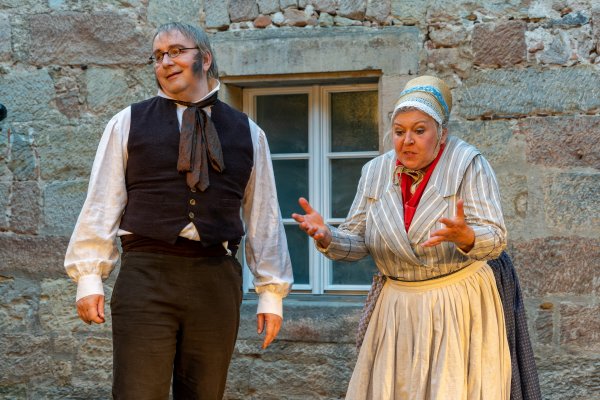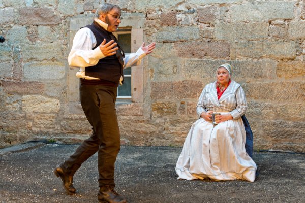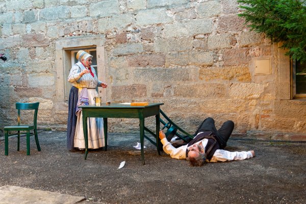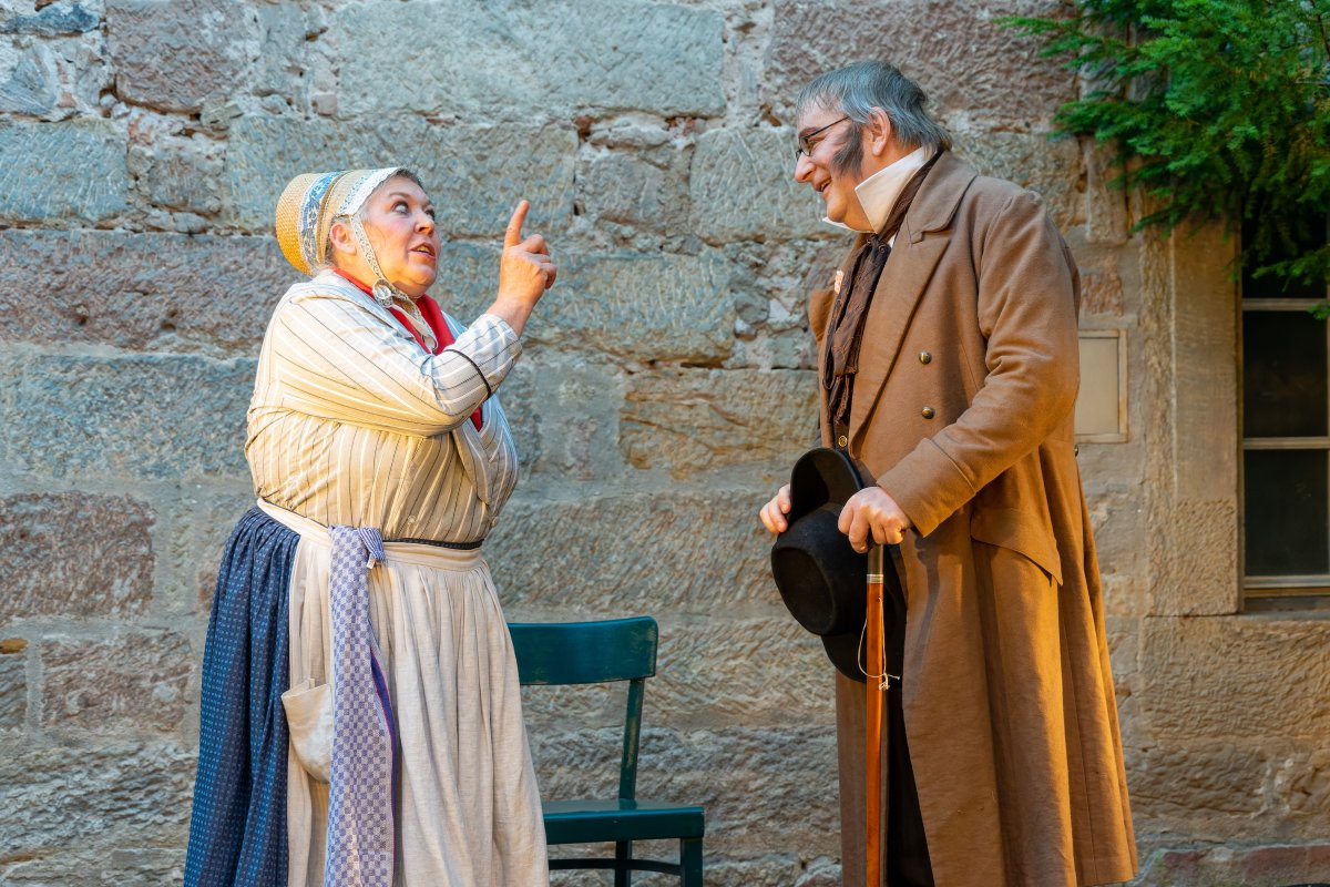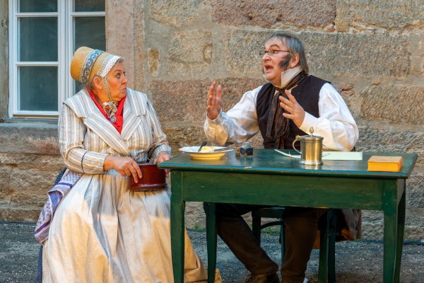 Dorthin stieg er „hinauf und hinaus aus der Stadt mit den engen Winkeln, den engen Winkelgedanken“, dort konnte er aufatmen, Kraft und Ruhe schöpfen. In vier szenischen Etüden und einem Epilog frei nach Texten von Jean Paul beschreibt der Mundartforscher, Autor und Kabarettist Eberhard Wagner unter dem Titel „Der Legationsrat“ Gefühle und Gespräche zwischen den beiden ungleichen Partnern, wie sie vielleicht waren oder zumindest hätten sein können. Er lässt ihn bildstark erzählen vom „Immergrün der Gefühle“ und von den schönen Seiten des Bieres, von einem todessehnsüchtigen Traum und des Schreibers abgrundtiefem Hass auf den Krieg.